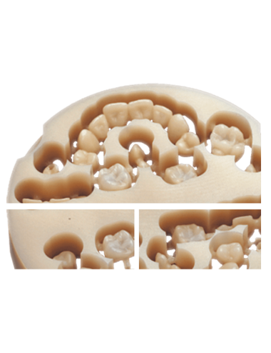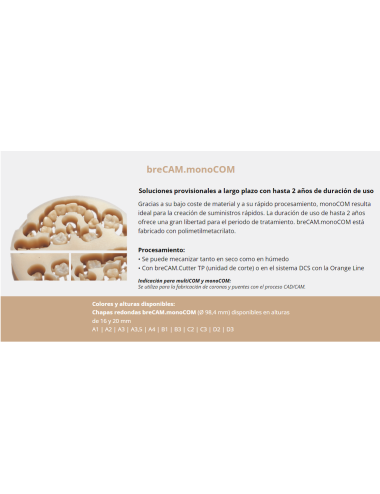 Para restauraciones provisionales de larga duración, para un uso de hasta dos años base de polimetilmetacrilato con bajo contenido en materiales de relleno Sustituto dental provisional de gran estética con escasos costes de material y poco tiempo de trabajo Aplicación y procesamiento Propiedades optimizadas del material en cuanto a la resistencia y la actuación frente a la abrasión. Resulta ideal para el arranque de viruta en seco o húmedo. Vida útil Dos años es una vida útil óptima para una restauración provisional que se llevará en el marco de intervenciones quirúrgicas y durante fases de regener
