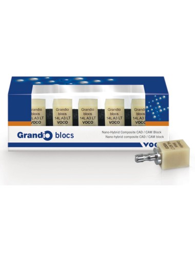 Disco CAD/CAM de composite nano híbrido, para la fabricación de inlays, onlays, carillas o coronas para restauraciones permanentes. La característica especial de Grandio disc reside en sus extraordinarios parámetros físicos. De esta forma, el material ofrece una similitud al diente natural impecable. Posibilidad de fresado preciso del disco de composite, lo que a su vez garantiza una mejor precisión de ajuste. Además, en los composites se suprime el largo proceso de cocción, y estos se pueden procesar con mayor rapidez usando aparatos de tallado y pulir de forma óptima. Disponible en dos niveles de translucidez: LT, especialmente apto para restauraciones en la zona anterior, y HT , idóneo para restauraciones en la zona posterior. 146x47x139