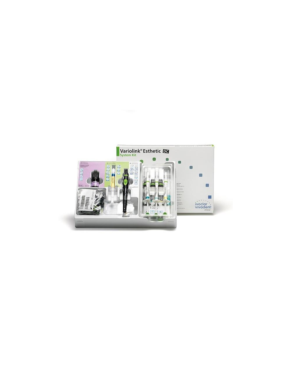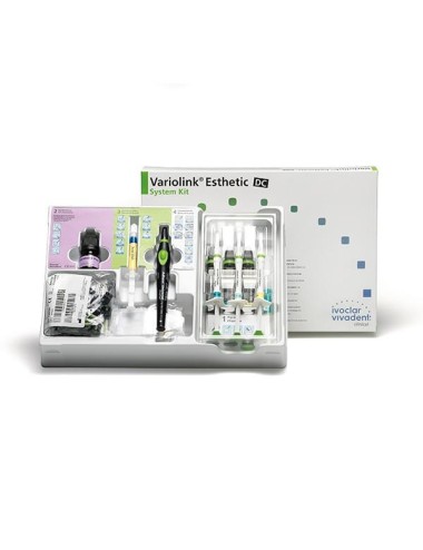 VI62274 3 Jeringas Variolink -Esthetic DC, 5 g (light, neutral, warm).3 Jeringas Variolink -Esthetic Try-ln Paste, 1,7 g (light, neutral, warm) .Jeringa Total Etch, 2 g.Frasco Monobond Plus, 5 g.1 Jeringa Liquid Strip, 2,5 g.Accesorios.System Kit.AdheSE UniversalVivaPen 2 ml.