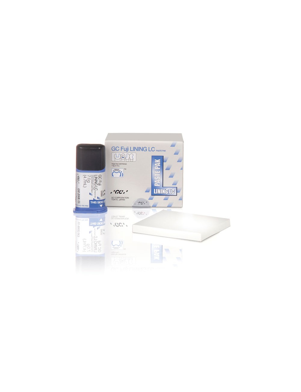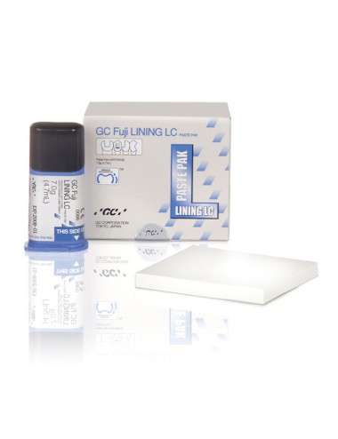 Material protector de ionómero de vidrio fotocurable, pasta-pasta. El GC Fuji Lining LC Paste Pak, es el primer cemento protector de ionómero de vidrio con resina, fotocurable, disponible en pasta.El cartucho de 7 g + 1 block de mezcla.