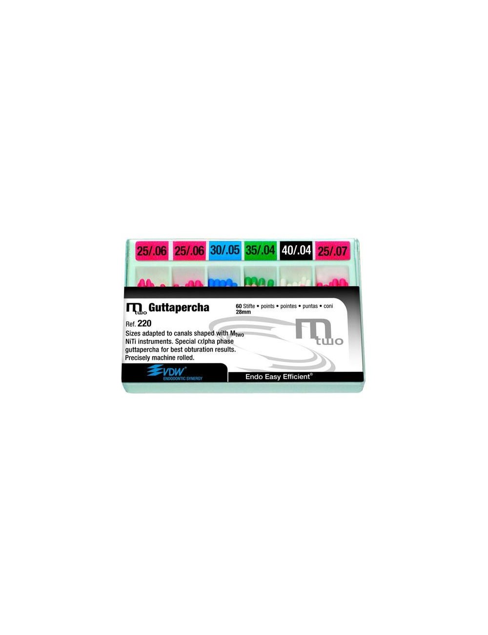 Para todos los métodos de obturación. Tamaños y conicidades adaptados a los instrumentos Mtwo. -Estandarizadas según ISO.Caja de 60 unidades.