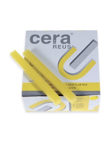 RE02034 -Especialmente indicada para tomas de registros oclusales, en desdentados totales y parciales. Presentada en barras de fácil manejo y aplicación. Precisa de un poco de calentamiento y tiene una dureza y elasticidad normal.- Contenido: 500g.- Nº Barras: 50.- Medidas Barra: 100*10 mm.- Calibre: 10 mm.- Punto de fusión: 62/63ºC.