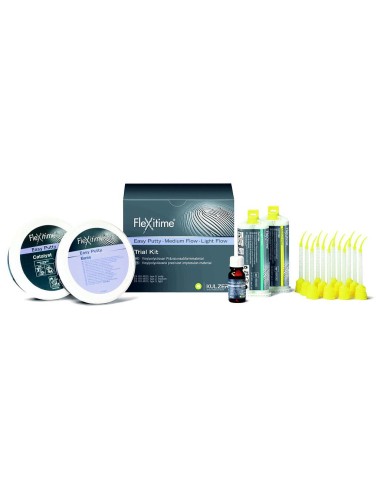 Fórmula ATS -Advanced Therma Sense. Gracias a este nuevo sistema sensible a la temperatura y a la humedad el tiempo de permanencia en boca es de 2 min. 30 seg. independientemente de que el tiempode manipulación sea 1 min. o aumente a 2 min. 30 seg. - Todos los materiales Flexitime son hidrófilos - En condiciones de humedad reproduce excelentemente los detalles - Manejo sencillo. - Nuevo sistema de mezcla 1:1. Menos esfuerzo durante la toma de impresión - Menos material residual CONTENIDO : 1 x Light Flow 50 ml + 1 x Médium Flow 50 ml + 1 x Easy Putty 600 ml + 12 x Mixing Tips yellow(1:1) + 12 x Intraoral Tips yellow
