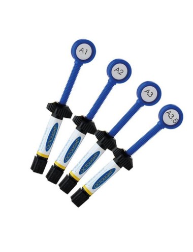 Composite Universal Nano Hibrido para anteriores y posteriores. Sistema de Color Duo Shade Relleno fluorescente para una óptima estética. Resultado clínico probado.