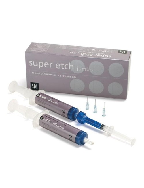 DI60211 Super Etch con ácido fosfórico al 37% es un agente grabador para esmalte y dentina. Super Etch es un gel fácilmente controlable que fluye según la dirección de la aplicación, no por la gravedad.2 Jeringas Jumbo Super Etch de 25mL. 2 Jeringas Super Etch de 25mL (62.5g)50 puntas de aplicación desechables.