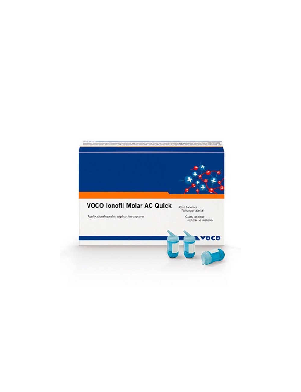 La versión de endurecimiento rápido de VOCO Ionofil Molar AC en cápsulas de aplicación.Restauración de la clase I (áreas sin oclusión). Restauraciones temporales de larga duración en clases I y II. Base cavitaria y rellenos en restauraciones. Reconstrucción de muñones. Restauración de dientes temporales. Restauración de defectos cuneiformes y erosiones cervicalesadamantinas. Inmediatamente empaquetable. Consistencia no pegajosa. Muy alta resistencia compresiva, transversal y a la abrasión. Un 40% más cemento disponible que en otras cápsulas comparables de materiales dentocolorados. Adhesión segura al esmalte y a la dentina. Restauraciones estables sin brechas. Alta liberación contínua de flúor. Radiopaco. Biocompatible. Translucidez estética similar al diente. En 4 colores (A1, A2, A3, B3)Un tiempo de endurecimiento de sólo 2,5 minutos hacen de VOCO Ionofil Molar AC Quick el material perfecto para el tratamiento de niños o pacientes inquietos.48 cápsulas A3.