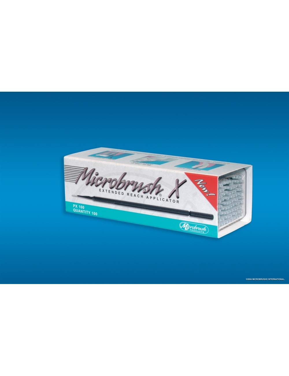 El miembro más reciente de la familia Microbrush. Se ha diseñado con una punta más fina y alargada del cepillo para simplificar la aplicación en intervenciones en entornos de espacio reducido, como colocación de uniones, empastes, cementación de fundas y sobre todo para tratamiento en canales. Las fibras más cortas y rígidas mantienen una fracción de una gota del material para la colocación precisa, permitiendo además frotar. Para facilitar su uso, el aplicador se dobla y permanece doblado hasta 90 grados. El kit Microbrush X incluye un cartucho de 100 aplicadores y un Dispensador uno a uno.