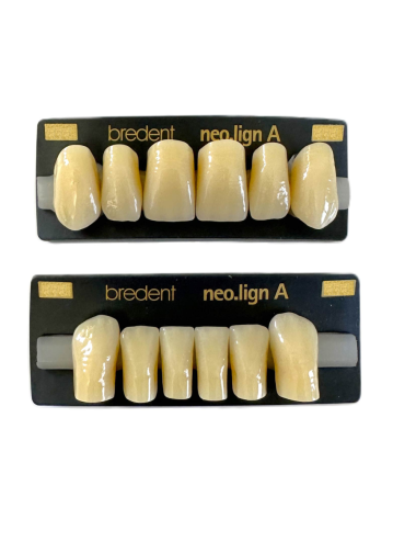 Los dientes completos neo.lign® están formados por 5 capas finas de un composite de PMMA (polimetilmetacrilato) resistente a grandes impactos y 4 capas cromáticas. Son adecuados para la confección de restauraciones con prótesis totales y para la técnica combinada. La alta resistencia mecánica de los dientes neo.lign®los hace ideales para las prótesis dentales implantosoportadas. Al igual que las carillas novo.lign®, los dientes completos neo.lign® se fabrican tomando como modelo arcadas de dientes reales. Gracias a esto, su aspecto resulta particularmente natural. La estratificación morfológica proporciona además un efecto de profundidad natural. Los dientes completos neo.lign® tienen el mismo color, forma y material que las carillas novo.lign®. La estratificación de neo.lign® y la de novo.lign® también están perfectamente armonizadas. --Esto permite la combinación perfecta de neo.lign® con novo.lign®. La superficie homogénea y densa de los dientes completos neo.lign® garantiza la solidez de los colores y la resistencia a la placa a largo plazo